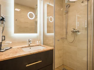Das Bad ist mit Dusche, Fön und Kosmetikspiegel ausgestattet und bietet Ihnen alles für den perfekten Start in den Tag. Die Nichtraucher-Zimmer sind allergikerfreundlich und überzeugen durch klare Linien und eine ruhige Atmosphäre im Inneren – selbst wenn draußen das urbane Leben pulsiert.